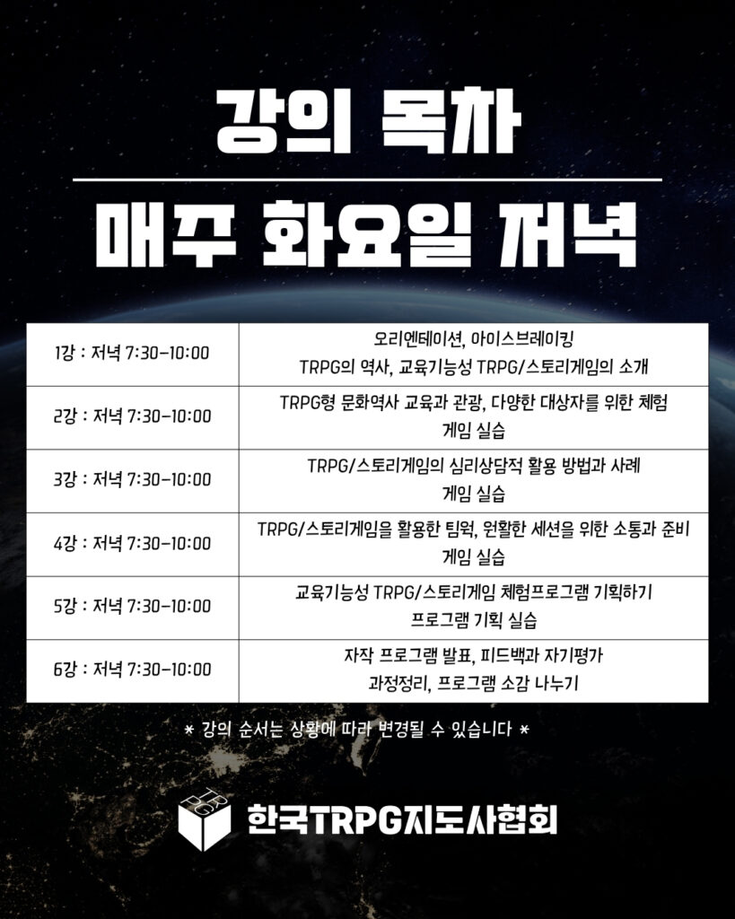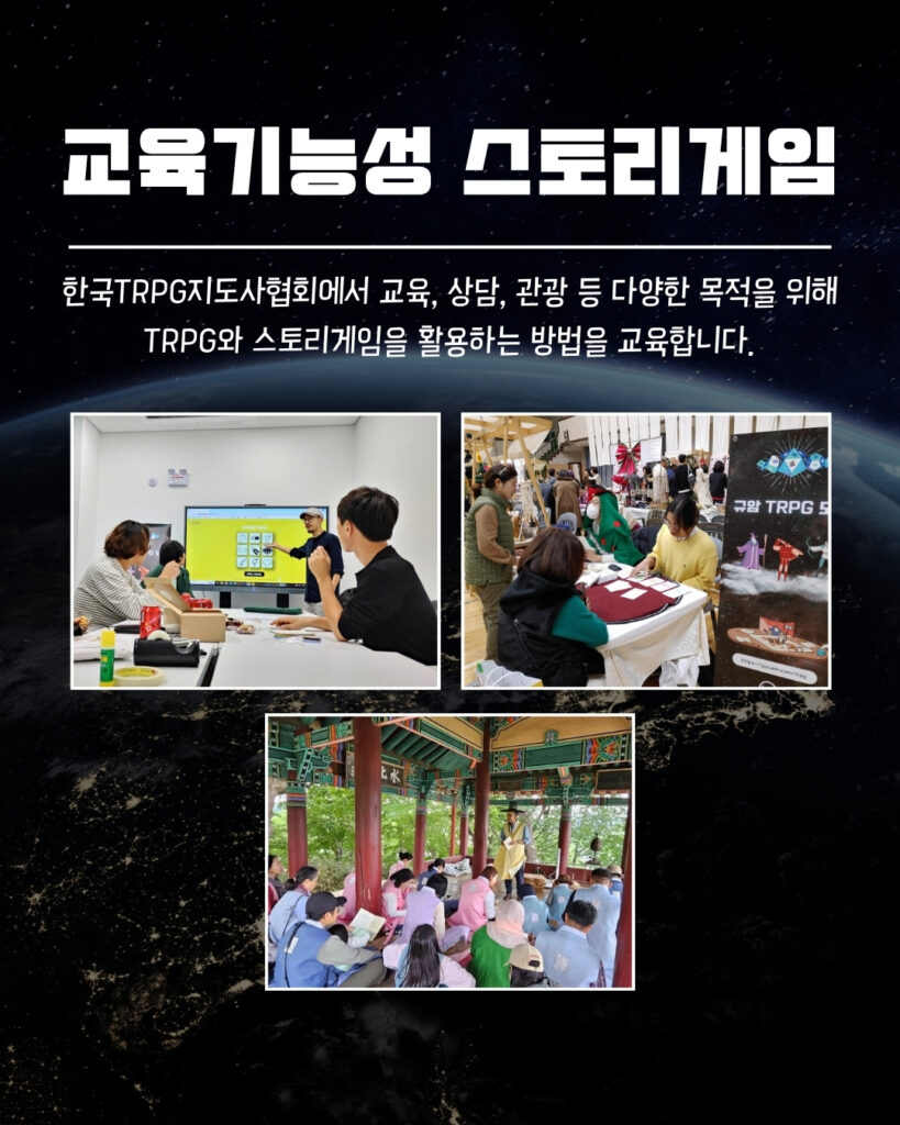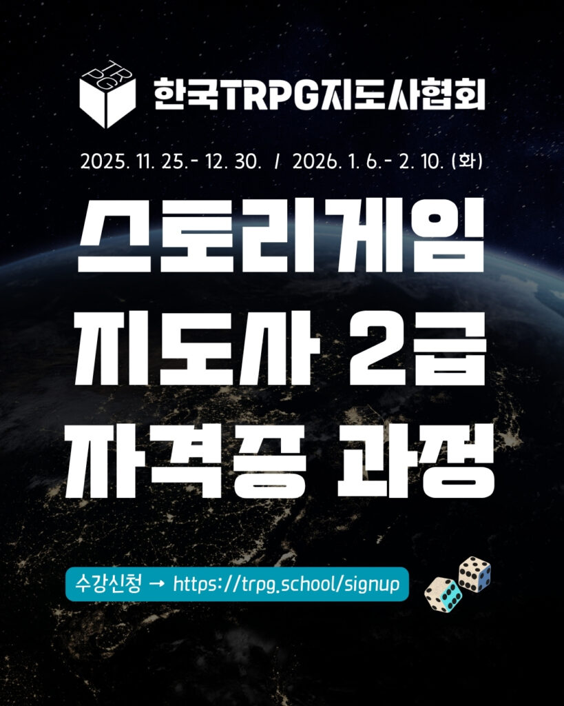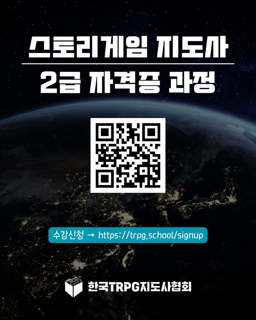 한국TRPG지도사협회의 첫 번째 <스토리게임 지도사 2급 자격증 과정>을 함께 할 수강생을 모집합니다! 교육기능성 TRPG와 스토리게임 프로그램을 지도하는 방법에 대해 사례와 실습을 통해 배웁니다.