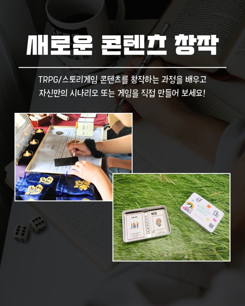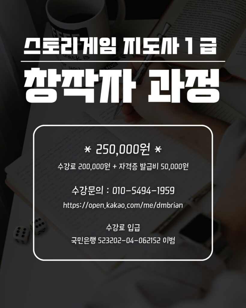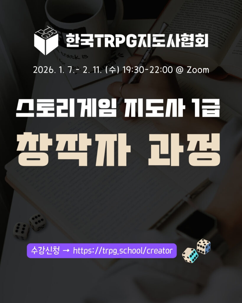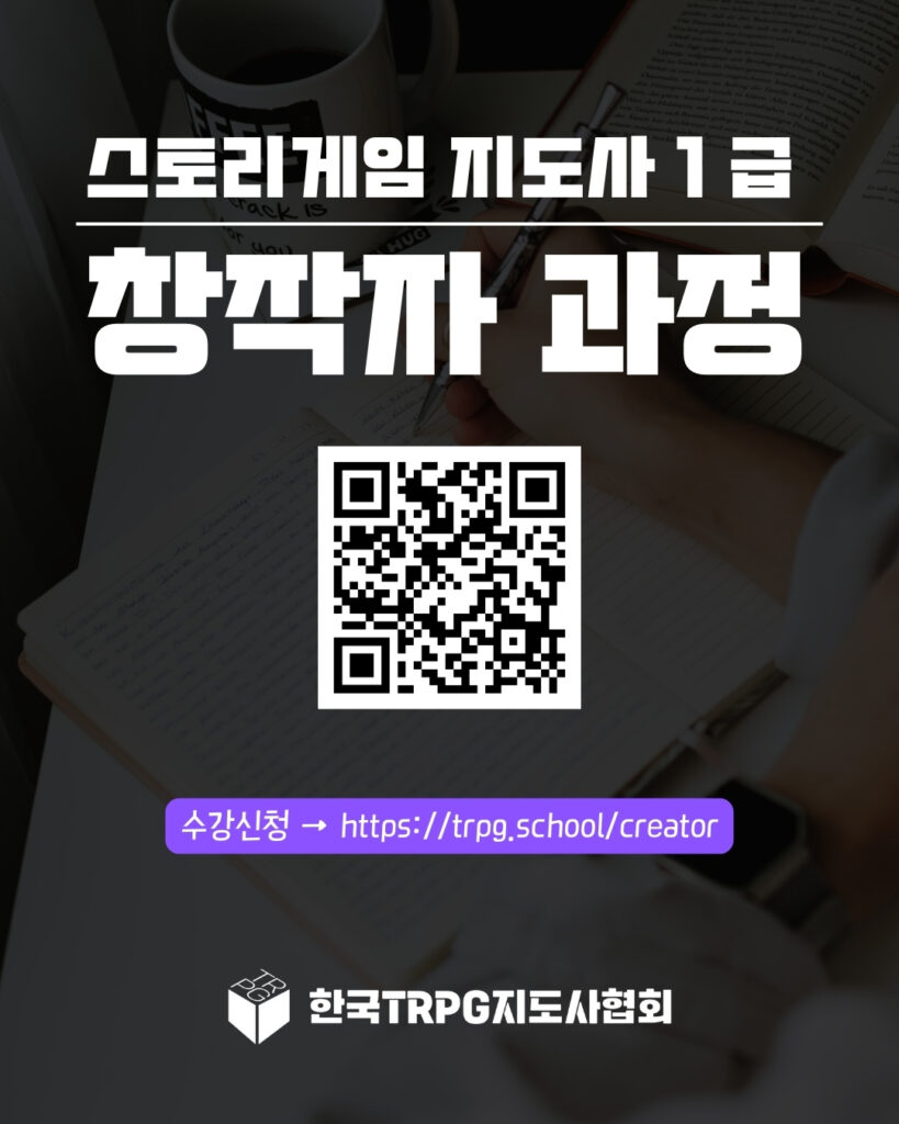 한국TRPG지도사협회의 첫 번째 <스토리게임 지도사 1급 창작자 과정>을 함께 할 수강생을 모집합니다! 새로운 TRPG 시나리오, 게임 등 콘텐츠를 직접 만드는 과정에 대해 배웁니다. 자신의 창작물을 직접 만들고 워크숍을 통해 서로 피드백을 나눕니다.