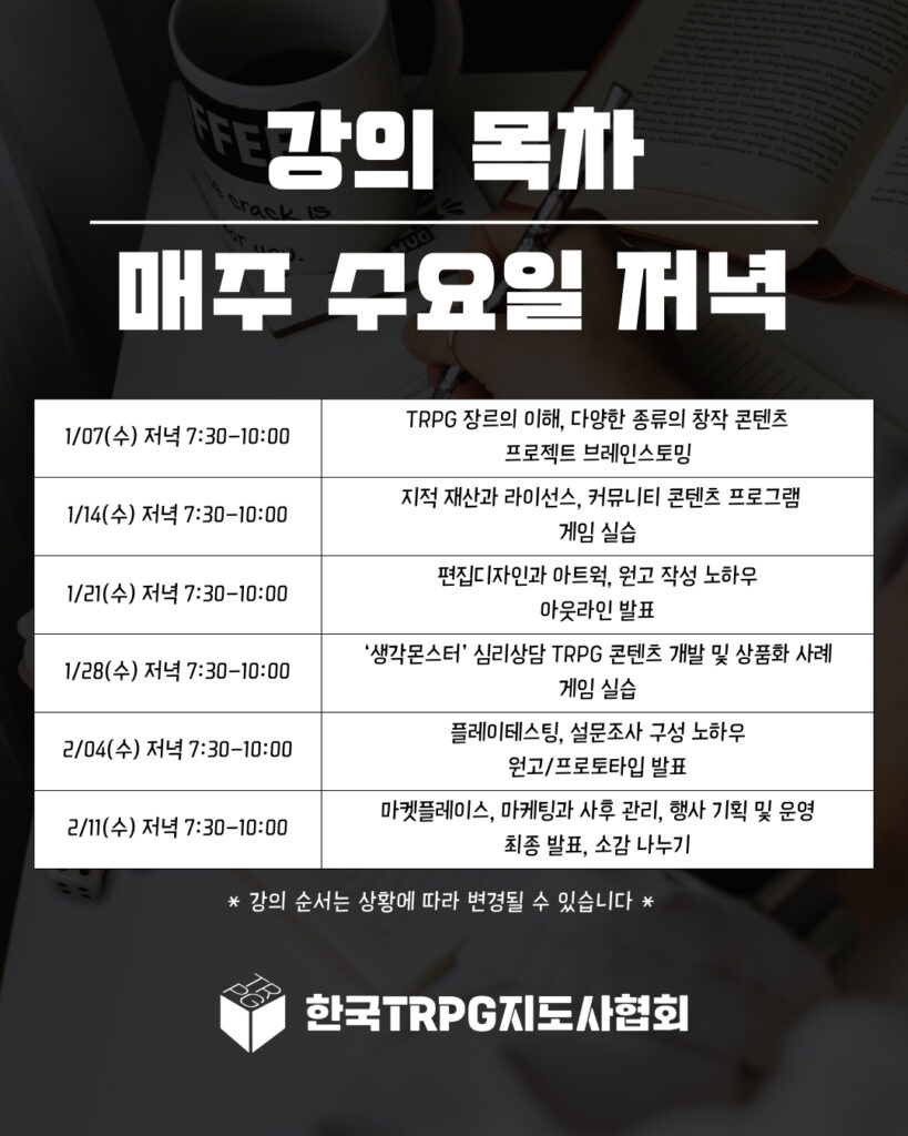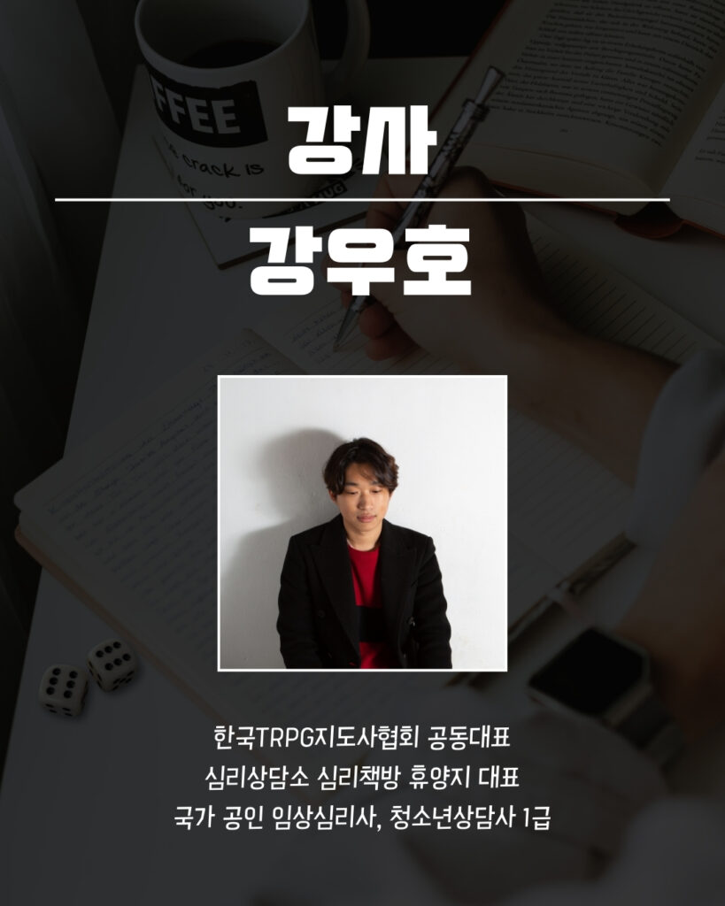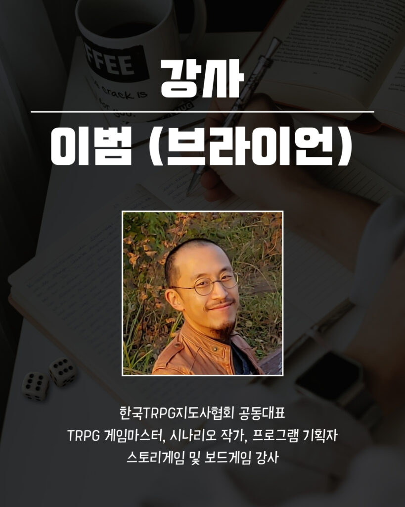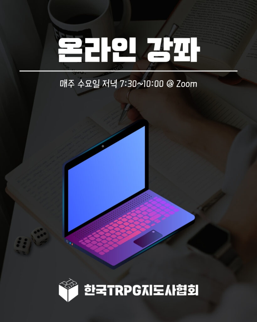 한국TRPG지도사협회의 첫 번째 <스토리게임 지도사 1급 창작자 과정>을 함께 할 수강생을 모집합니다! 새로운 TRPG 시나리오, 게임 등 콘텐츠를 직접 만드는 과정에 대해 배웁니다. 자신의 창작물을 직접 만들고 워크숍을 통해 서로 피드백을 나눕니다.