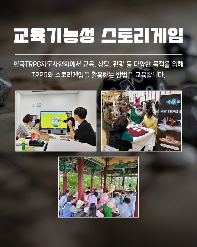 한국TRPG지도사협회의 <스토리게임 지도사 2급 자격증 과정>을 함께 할 수강생을 모집합니다! 교육기능성 TRPG와 스토리게임 프로그램을 지도하는 방법에 대해 사례와 실습을 통해 배웁니다.